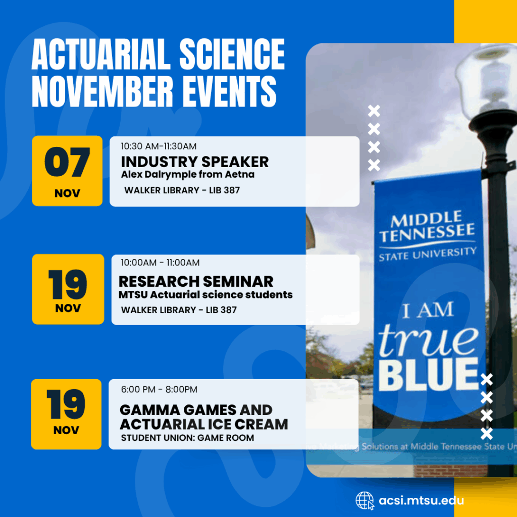 Industry Speaker – David Phillips, ASA, Fortitude Re, October 24, 2025. Join us for “A Puzzling Actuarial Journey”, an in-person talk by David Phillips, a former MTSU graduate who will share his unconventional path through the actuarial profession and the valuable lessons he’s learned along the way.